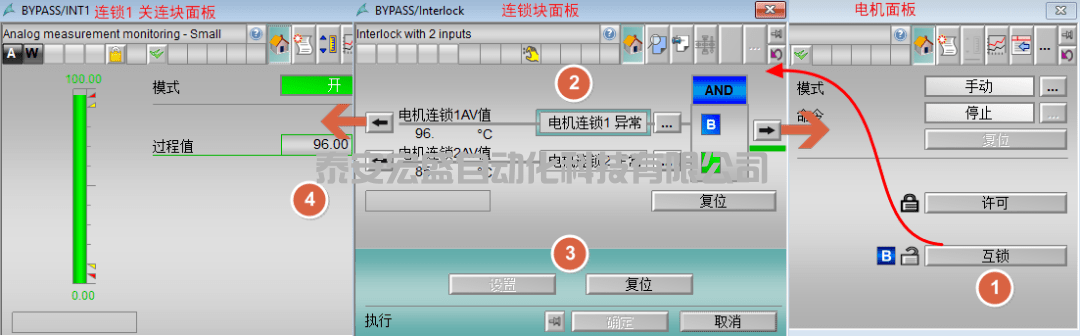 對于OS側(cè),則只需執(zhí)行OS編譯,互鎖塊可不創(chuàng)建塊圖表,通過工藝塊面板中的互鎖按鈕跳轉(zhuǎn)即可。在互鎖面板中可詳細看到各連鎖是否正常,對于異常信號可進行旁路操作。而且可從互鎖面板跳轉(zhuǎn)回工藝塊或連鎖管腳所互連塊的面板。