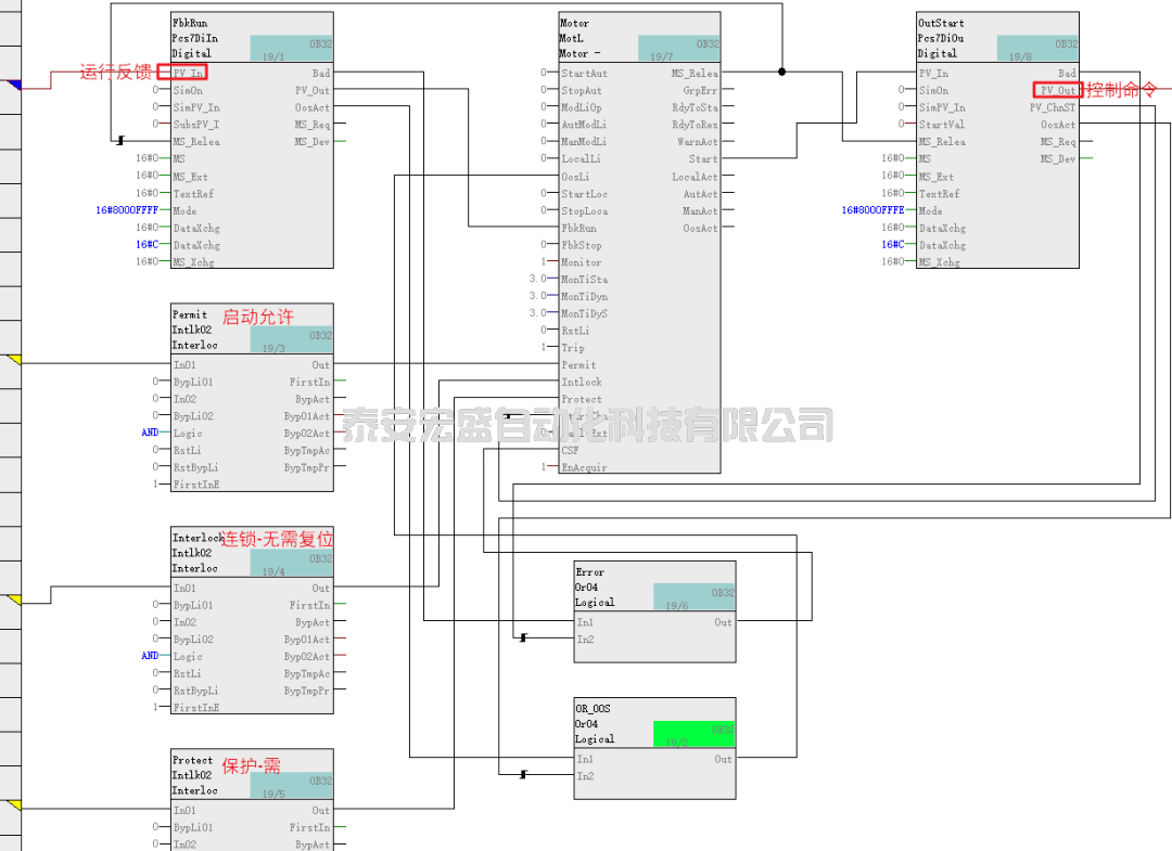 以電機模板為例,工藝塊搭配互鎖塊不僅可以實現(xiàn)連鎖功能,還可以實現(xiàn)連鎖旁通、連鎖首出、輔助值功能等。