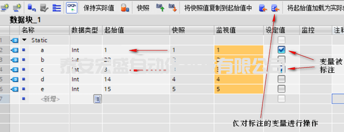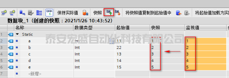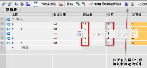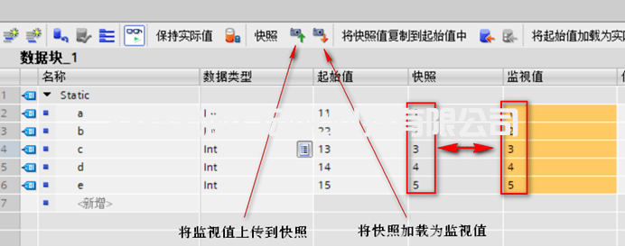 ↑↑↑關(guān)注不迷路,專(zhuān)業(yè)知識(shí)早知道!所有文章內(nèi)容皆由西門(mén)子高級(jí)權(quán)威專(zhuān)家技術(shù)團(tuán)隊(duì)所著。首先點(diǎn)擊監(jiān)控按鈕,使數(shù)據(jù)塊DB保持在線(xiàn),再次點(diǎn)擊快照欄中的“實(shí)際值的快照”按鈕,數(shù)據(jù)塊中變量在這一時(shí)刻的實(shí)際值(菜單顯示為監(jiān)視值)被抓拍并上傳至快照欄中