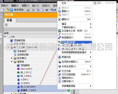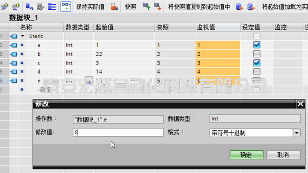 除了上述的按鈕外,還有一些廣為熟知通用的操作可以在DB塊中直接修改變量的監(jiān)視值,例如點(diǎn)擊數(shù)據(jù)塊中的變量,鼠標(biāo)右鍵選擇“修改操作數(shù)”或者雙擊變量的“監(jiān)視值”可以直接修改變量的過(guò)程值,如圖所示,這樣就可以節(jié)省打開(kāi)變量表再修改變量的時(shí)間了。
