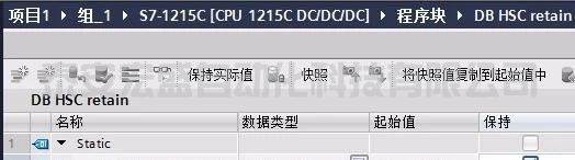 添加一個(gè)新的 DB 命名為 DB HSC retain,并且創(chuàng)建一個(gè)DINT數(shù)據(jù)元素,命名為HSC_1用于保存高速計(jì)數(shù)器的值。為了實(shí)現(xiàn)這個(gè)功能,HSC_1通過勾選保持項(xiàng)實(shí)現(xiàn)數(shù)據(jù)保持。此外創(chuàng)建系統(tǒng)數(shù)據(jù)類型HSC_Count的變量Static_1用于CTRL_HSC_EXT指令。