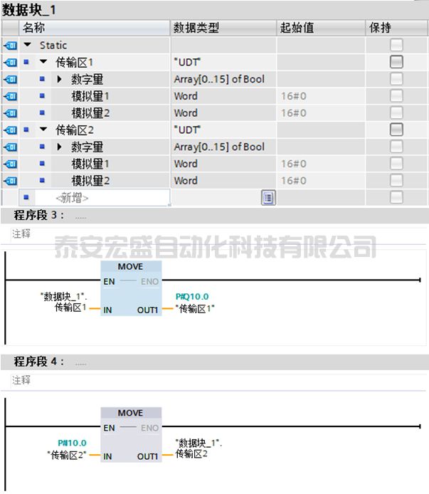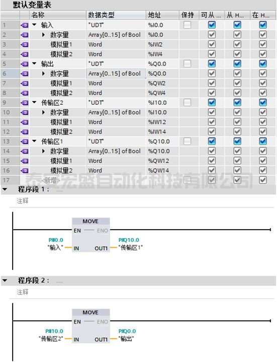 在默認變量表中分別定義輸入、輸出、傳輸區(qū)1、傳輸區(qū)2所對應的IO數(shù)據(jù)區(qū),這樣就可以使用MOVE指令來整體傳輸了。