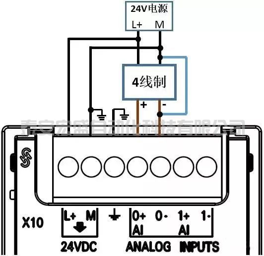 圖1 模擬量模塊接線 模擬量電流、電壓信號根據(jù)模擬量儀表或設備線纜個數(shù)分成四線制、三線制、兩線制三種類型,不同類型的信號其接線方式不同。四線制信號指的是模擬量儀表或設備上信號線和電源線加起來有4根線。儀表或設備有單獨的供電電源,除了兩個電源線還有兩個信號線。四線制信號的接線方式如下圖2模擬量電壓/電流四線制接線所示。