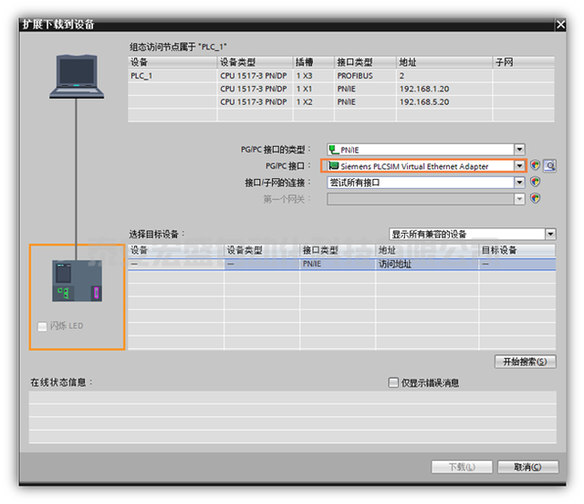 (8)下載PLC程序時,將PG/PC接口設(shè)置成Siemens PLCSIM Virtual Ethernet Adapter。