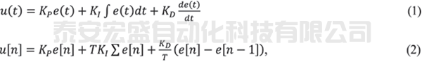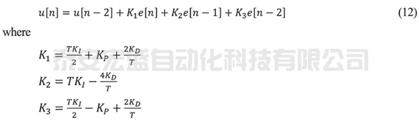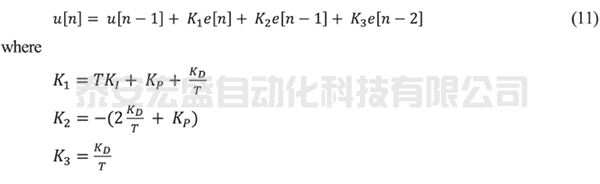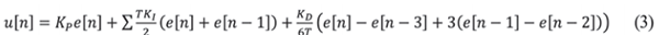 其中 u[n] 是當(dāng)前時(shí)間 n 的驅(qū)動(dòng)值,e[n] 是時(shí)間 n 的調(diào)節(jié)誤差, e [n-1] 是前一采樣時(shí)間 n-1 的調(diào)節(jié)誤差。T 是采樣的時(shí)間段。相同的時(shí)間段 T 用于信號(hào)處理,即用于 u[n] 的計(jì)算。