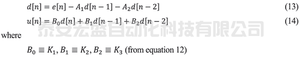 等式 9 和等式 10 適用于在 z 域中對(duì)控制系統(tǒng)建模(例如在 Matlab 中),但不能由任何控制器直接實(shí)現(xiàn)。然而,在對(duì)等式 9 進(jìn)行 z 逆變換后,您將得到以下等式