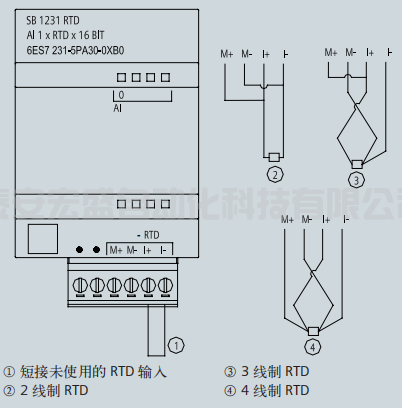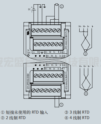 熱電阻模塊用于對熱電阻輸出的電阻信號進(jìn)行接收,熱電阻模塊也有4AI和8AI兩種,下面以SM 1231RTD 4AI為例看一下接線圖。