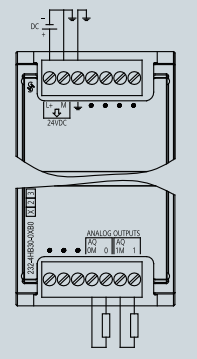 S7-1200 PLC有2AQ和4AQ兩種模擬量輸出模塊,可以輸出±10V的電壓信號、4-20mA或0-20mA的電流信號。下面以SM1232 2AQ為例看一些模塊的接線。