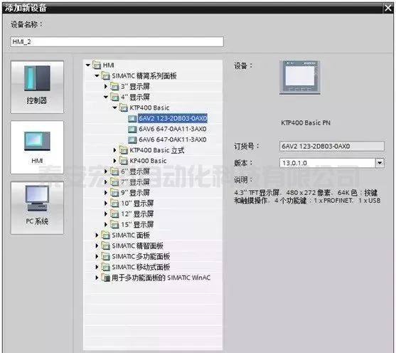 雙擊項(xiàng)目樹(shù)中的“添加新設(shè)備”,選中“添加新設(shè)備”對(duì)話框中的KTP400 Basic精簡(jiǎn)面板,不要勾選“啟用設(shè)備向?qū)А睆?fù)選框。單擊“確定”按鈕確認(rèn)。