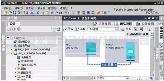 雙擊項(xiàng)目視圖中的“設(shè)備和網(wǎng)絡(luò)”,打開(kāi)網(wǎng)絡(luò)視圖。單擊“連接”按鈕,自動(dòng)選中“HMI連接”。用拖拽的方法連接HMI和PLC的PN接口,自動(dòng)生成HMI_連接_1。