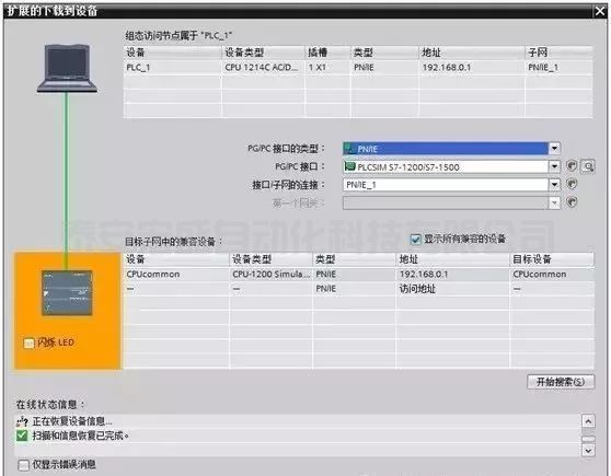 同時(shí)出現(xiàn)“擴(kuò)展的下載到設(shè)備”對(duì)話框。按下圖設(shè)置好“PG/PC接口的類型”“PG/PC接口”和“接口/子網(wǎng)的連接”,使用CPU的PN接口下載程序。