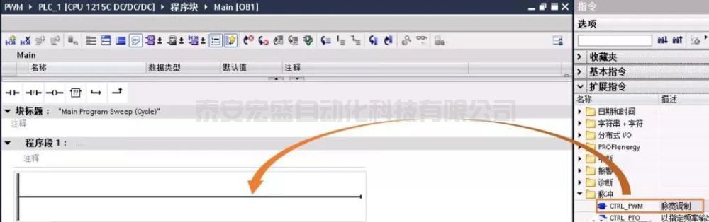 1. 在Portal軟件中打開程序塊,進(jìn)行PWM的編程。在指令選件中的“擴(kuò)展指令”中的“脈沖”文件夾中可以找到CTRL_PWM指令??梢酝ㄟ^雙擊指令或是拖拽的方式把CTRL_PWM指令放到程序編輯區(qū)。如下圖2.1所示: