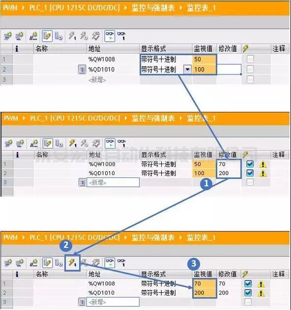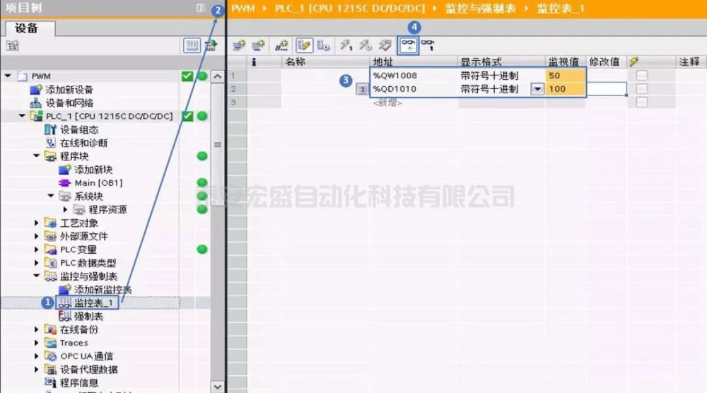 如下圖2.6所示,① 在Portal軟件左側(cè)項(xiàng)目樹中的“監(jiān)控與強(qiáng)制表”中插入一個(gè)新的監(jiān)控表,②在打開的空白監(jiān)控表中的“地址”列手動(dòng)輸入QW1008和QD1010,如然后在“顯示格式”一列選擇“帶符號(hào)十進(jìn)制”,如下圖步驟③所示。點(diǎn)擊監(jiān)控按鈕,如圖中④ 所示,可以看到QW1008的監(jiān)控值為50和QD1010的監(jiān)控值為100,該值分別是組態(tài)PWM時(shí)設(shè)置的初始脈沖寬度值和循環(huán)時(shí)間值。