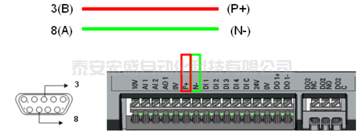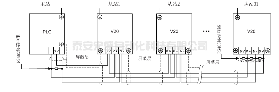 V20變頻器通過RS485線纜與PLC連接,使用標準的MODBUS通信協(xié)議進行通訊,通過modbus通訊,PLC給V20變頻器發(fā)送指令可對變頻器進行啟停調(diào)頻的操作。具體接線如下圖所示: