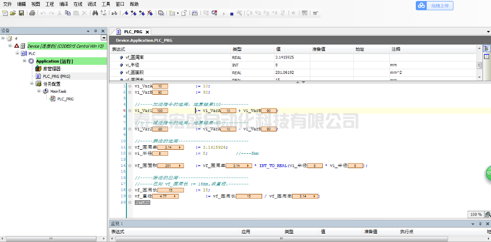 PROGRAM PLC_PRG VAR vi_VarA : INT; vi_VarB : INT; vi_Var1 : INT; vi_Var2 : INT; vf_圓周率 : REAL; vi_半徑 : INT; //mm vf_圓面積 : REAL; //mm^2 vf_圓周長 : REAL; //mm vf_直徑: REAL; END_VAR