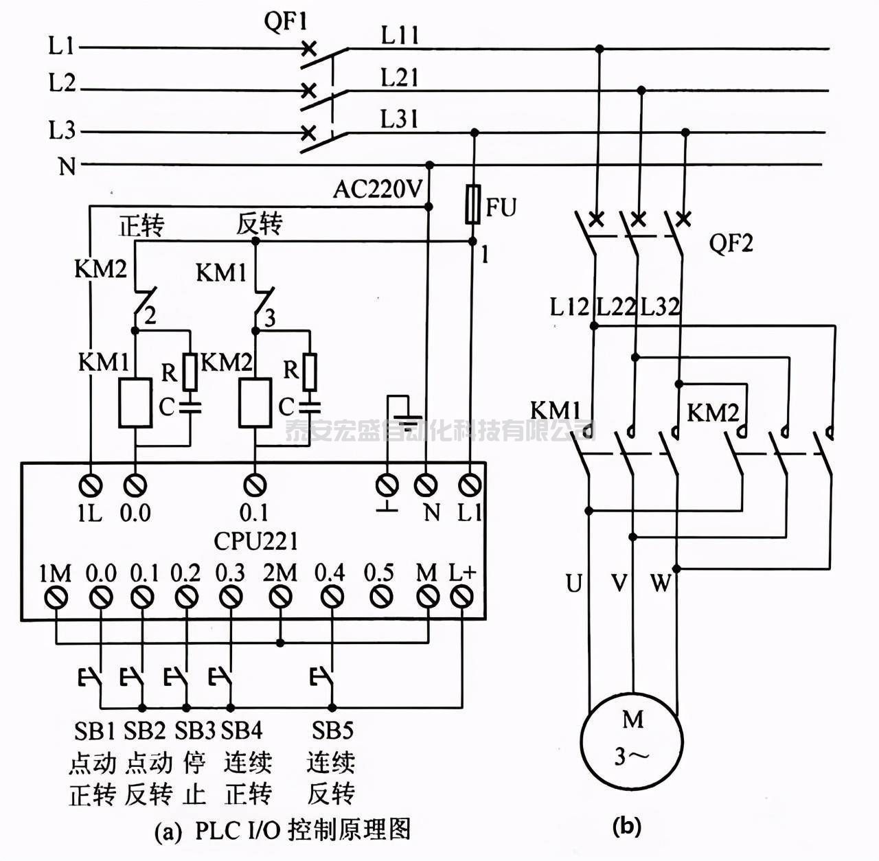 輸出信號(hào):正轉(zhuǎn)接觸器1個(gè)、反轉(zhuǎn)接觸器1個(gè),占用PLC兩個(gè)輸出端子,所以PLC輸出至少需2點(diǎn)。查西門子PLC用戶手冊(cè)可知,CPU221主機(jī)輸入6點(diǎn)、輸出4點(diǎn),能滿足實(shí)際需求的輸入5點(diǎn)輸出2點(diǎn)的要求。因PLC控制電動(dòng)機(jī),所以繼電器輸出型的PLC就能滿足要求,選擇CPU221繼電器輸出型的PLC即可。