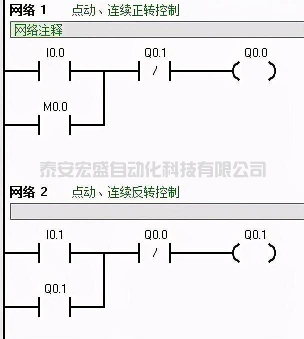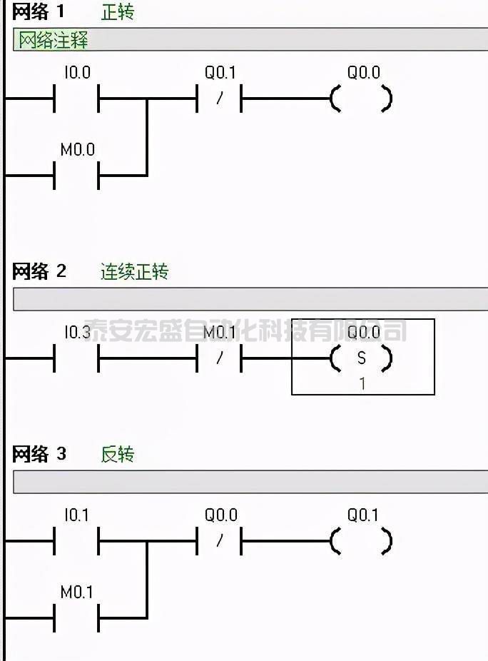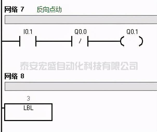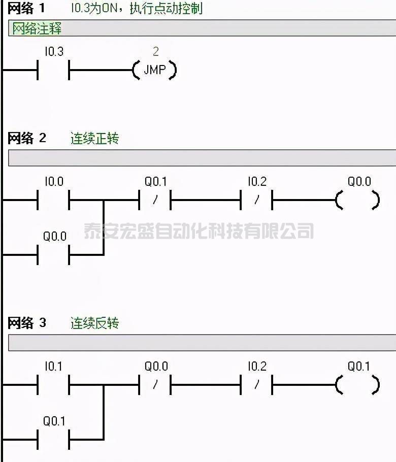 電氣原理圖可在圖1的基礎(chǔ)上稍作修改,輸入信號(hào)少用個(gè)按鈕,在此不再重畫電氣原理圖,程序中I0.3假設(shè)接通為點(diǎn)動(dòng),斷開(kāi)為連續(xù),控制程序如圖5所示。