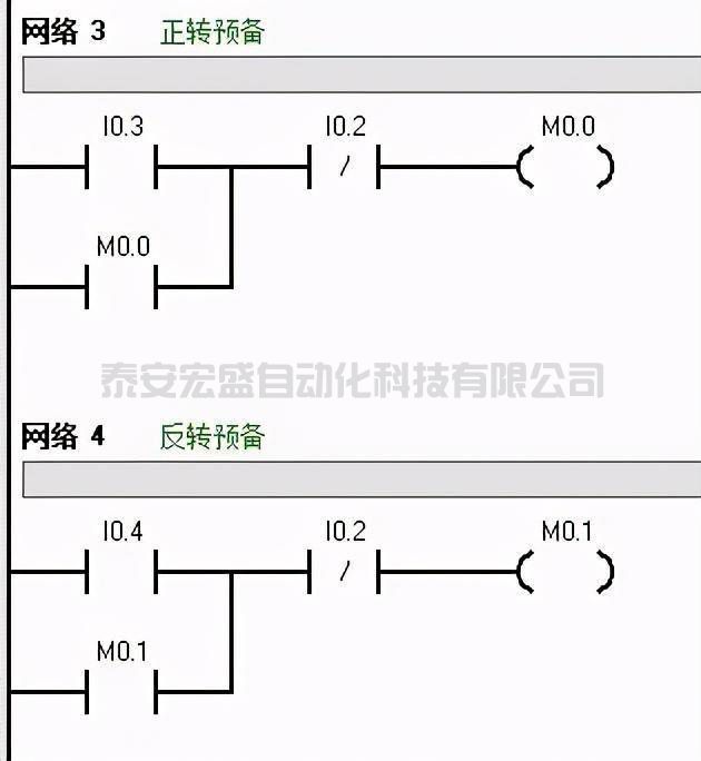 運(yùn)料車的控制要求既有點(diǎn)動(dòng)又有連續(xù)正反轉(zhuǎn)控制功能, 用中間繼電器進(jìn)行狀態(tài)轉(zhuǎn)換后就很較易實(shí)現(xiàn)要求,如圖3所示,網(wǎng)絡(luò)1、網(wǎng)絡(luò)3實(shí)現(xiàn)了既能點(diǎn)動(dòng)又能連續(xù)的正轉(zhuǎn)控制,網(wǎng)絡(luò)2、網(wǎng)絡(luò)4實(shí)現(xiàn)了既能點(diǎn)動(dòng)又能連續(xù)的反轉(zhuǎn)控制。