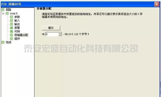 PID指令(功能塊)使用了一個120個字節(jié)的V區(qū)參數(shù)表來進行控制回路的運算工作;除此之外,PID向導生成的輸入/輸出量的標準化程序也需要運算數(shù)據(jù)存儲區(qū)。需要為它們定義一個起始地址,要保證該地址起始的若干字節(jié)在程序的其它地方?jīng)]有被重復使用。如果點擊“建議”,則向導將自動為你設定當前程序中沒有用過的V區(qū)地址。