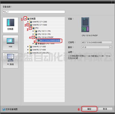 5.接下來我們先插入一個CPU1516-3PN/DP:請依次點擊“控制器”、“SIMATIC S7-1500”、“CPU”、“CPU 1516-3PN/DP”左側(cè)的小箭頭展開項目樹,然后選擇PLC訂貨號“6ES7 516-3AN00-0BA0”,最后點擊“確認”按鈕插入: