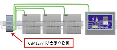 當(dāng)兩個以上的通信設(shè)備進行通信時,需要使用交換機來實現(xiàn)網(wǎng)絡(luò)連接。可以使用導(dǎo)軌安裝的西門子 CSM1277 4端口交換機來連接多個 CPU 和 HMI 設(shè)備,如圖 3. 多個通信設(shè)備的網(wǎng)絡(luò)連接所示。