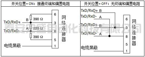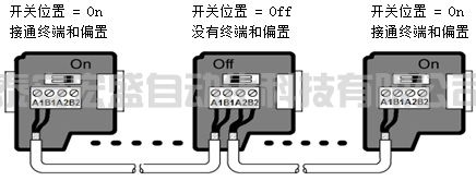 注意圓圈內(nèi)的"終端電阻"開關(guān)設(shè)置。網(wǎng)絡(luò)終端的插頭,其終端電阻開關(guān)必須放在"ON"的位置;中間站點的插頭其終端電阻開關(guān)應(yīng)放在"OFF"位置。