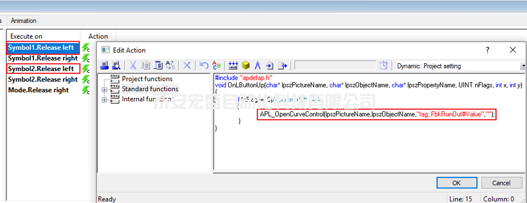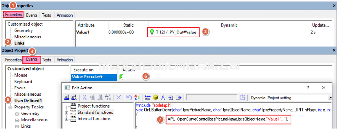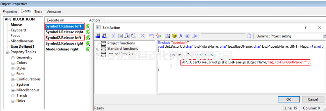 以 MonAnL 為例,APL 自帶功能塊圖標(biāo)之所以支持 AOTC 功能,是因?yàn)閴K圖標(biāo)中“ Event→UserDefined1→Value1.Release left”存在腳本“APL_OpenCurveControl”,當(dāng)按住 Ctrl 鍵的同時(shí)點(diǎn)擊塊圖標(biāo)中對(duì)應(yīng)模擬量值時(shí),會(huì)執(zhí)行以上腳本函數(shù)。