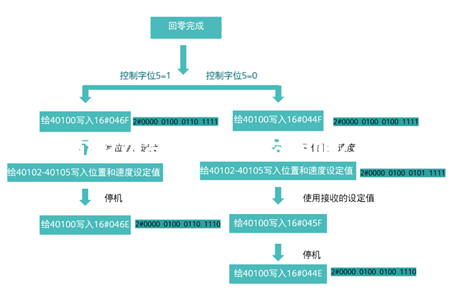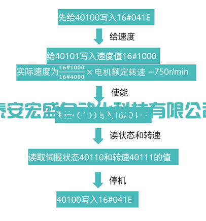然后 PLC 調(diào)用標(biāo)準(zhǔn)的 MODBUS RTU 功能塊對 V90 進(jìn)行控制??梢酝ㄟ^表4的控制字(40100)發(fā)送啟停命令,通過表5的狀態(tài)字(40110)監(jiān)控狀態(tài),通過速度設(shè)定值(40101)設(shè)置速度,通過速度實(shí)際值(40111)監(jiān)控實(shí)際速度,最后通過圖1的流程進(jìn)行控制和監(jiān)控。