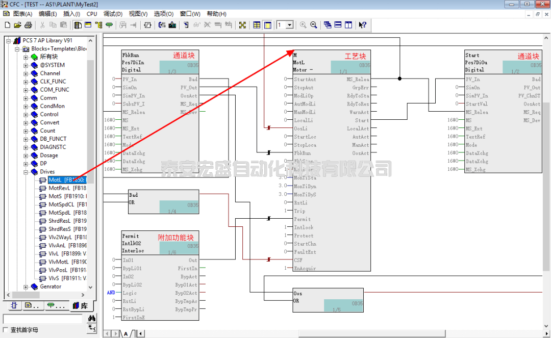 實(shí)際項(xiàng)目中,典型的控制回路通常由三部分構(gòu)成即通道塊、工藝塊(如電機(jī)和閥塊、給料塊、控制塊)和附加功能塊(如邏輯塊、轉(zhuǎn)換塊等)。接下來結(jié)合APL庫的兩種常用編程方式(使用模板和自行調(diào)用功能塊搭建回路)來舉例說明這些功能塊的典型應(yīng)用。
