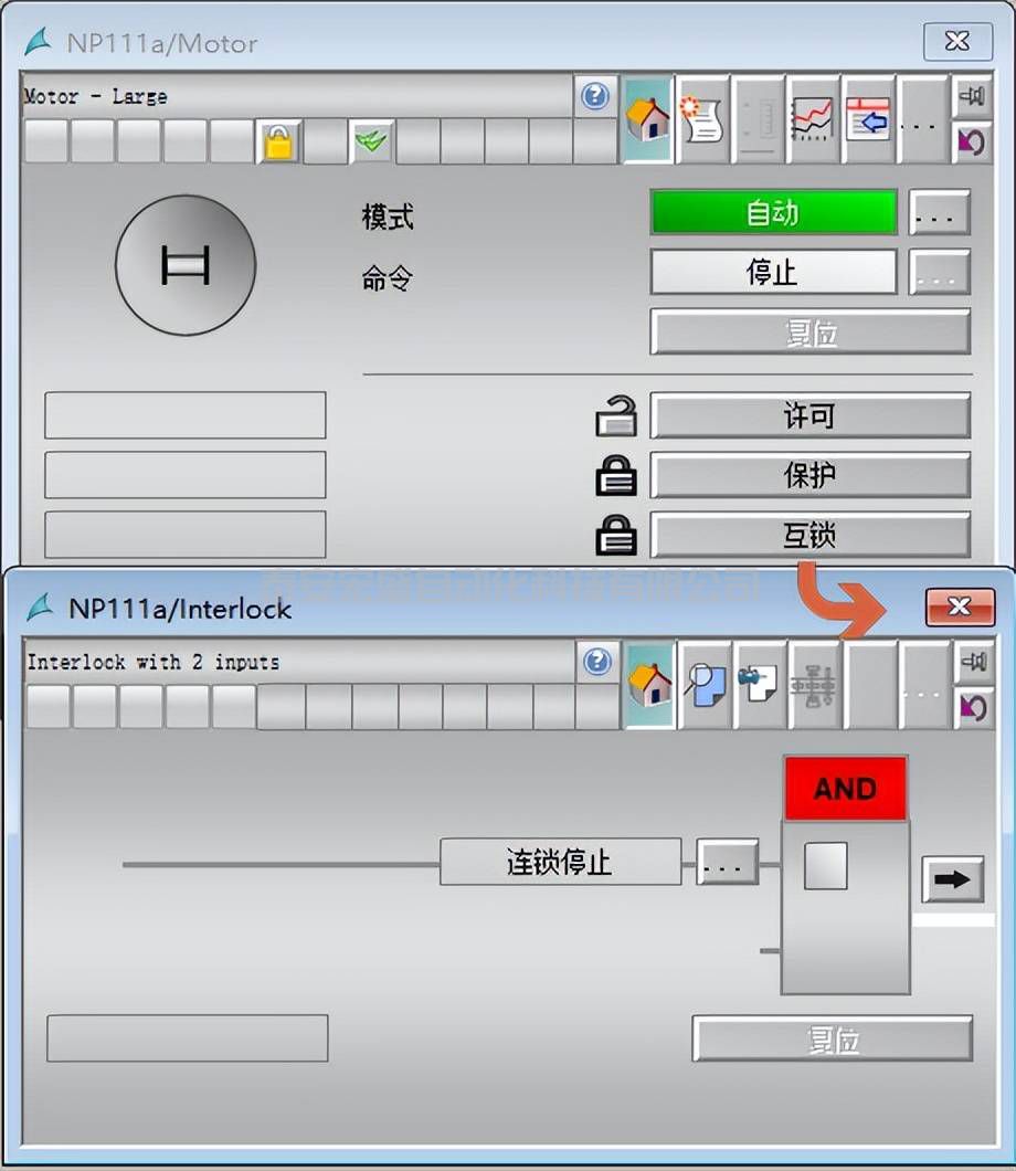如果只是簡單的應(yīng)用,其實(shí)我們只需要復(fù)制模板后連接運(yùn)行信號和控制命令就完成了下位機(jī)程序組態(tài)。執(zhí)行CFC和OS編譯后,在上位機(jī)上就會自動創(chuàng)建了對應(yīng)的塊圖標(biāo)和面板。把對應(yīng)的塊圖標(biāo)放置到流程圖中對應(yīng)的位置,就這么簡單的完成了上下位的組態(tài)。如果電機(jī)還涉及到啟動允許、連鎖保護(hù),模板中也提供了三種連鎖,并且擴(kuò)展到了Interlock功能塊。借助于Interlock功能塊還能在電機(jī)面板中查看連鎖狀態(tài)、跳轉(zhuǎn)到連鎖面板旁通連鎖信號。