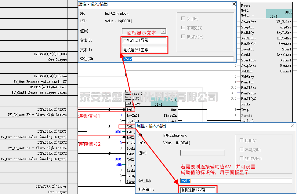 CFC中Intlk02的輸出Out和電機(jī)塊Intlock管腳互連,Intlk02的In01和In02連接連鎖信號(比如模擬量監(jiān)視塊的PV_AH_Act)。可為In01和In02指定上位機(jī)上顯示的文本即文本0和文本1的文本。若需要顯示連鎖信號相關(guān)的模擬值也可以連接AV管腳,并設(shè)置AV的標(biāo)識符用于上位機(jī)顯示。