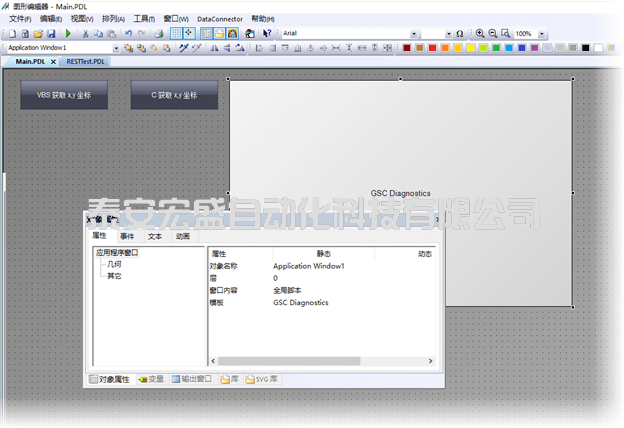 首先在畫(huà)面中添加兩個(gè)按鈕以及一個(gè)應(yīng)用程序窗口(窗口內(nèi)容:全局腳本;模板:GSC Diagnostics)。