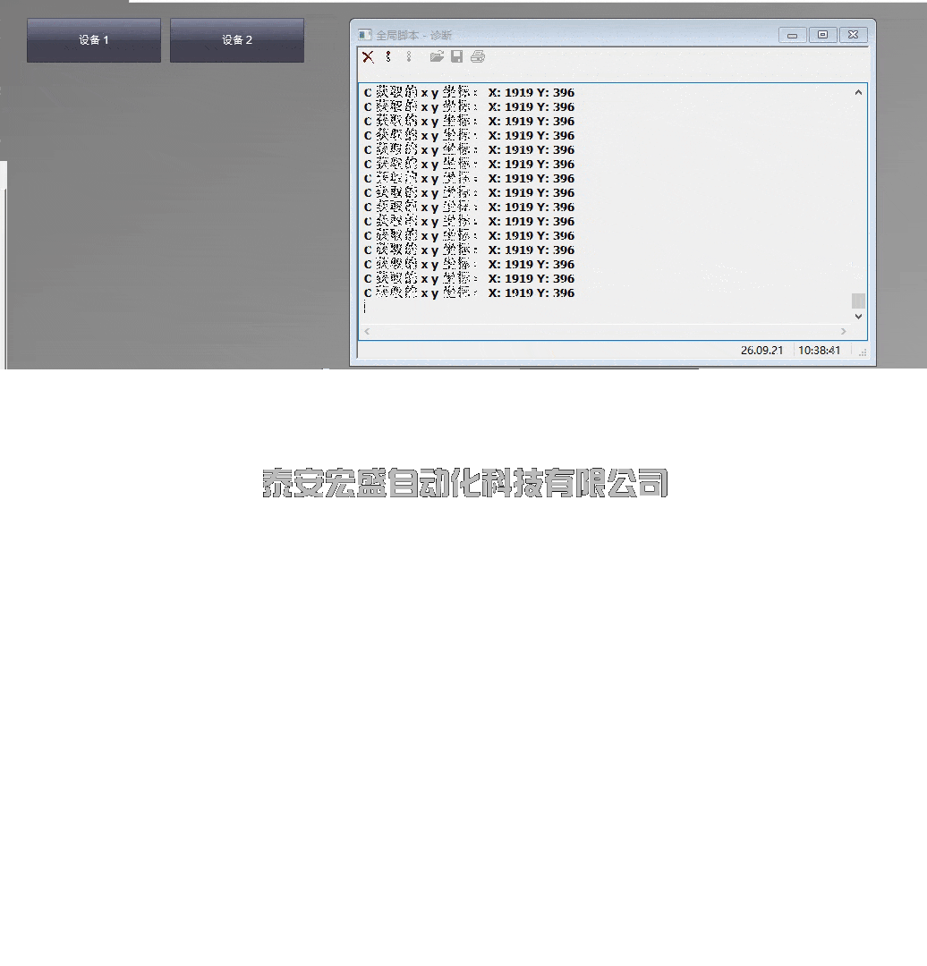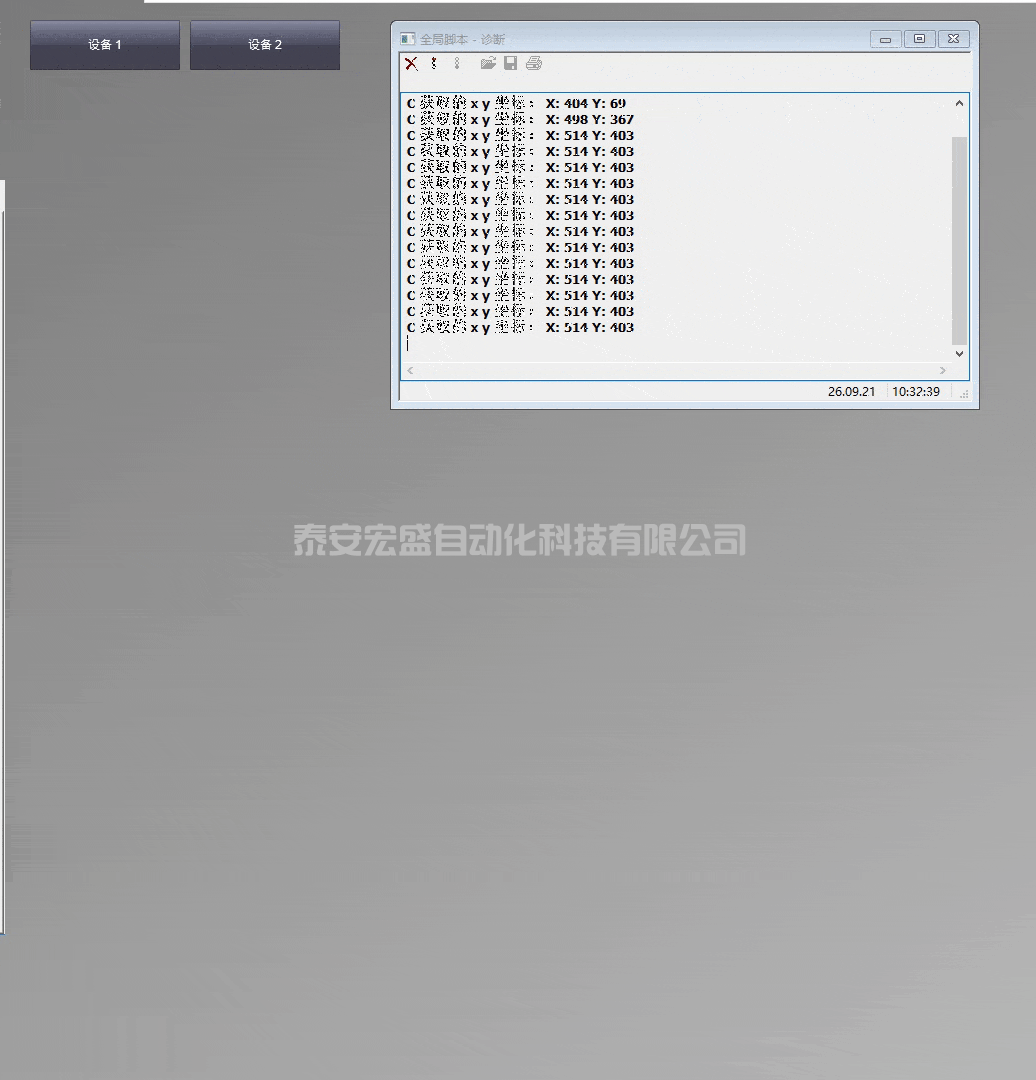 激活 WinCC 運(yùn)行系統(tǒng)后,在畫(huà)面中鼠標(biāo)分別按下兩個(gè)按鈕后,應(yīng)用程序窗口中將會(huì)輸出鼠標(biāo)按下時(shí)的 x,y 坐標(biāo)值。