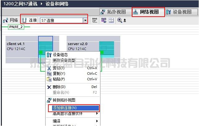 在“設備組態(tài)”中 ,選擇“網(wǎng)絡視圖”欄進行配置網(wǎng)絡,點中左上角的“連接”圖標,連接框中選擇“S7連接”,然后選中client v4.1 CPU(客戶端),右鍵選擇“添加新的連接”,在創(chuàng)建新連接對話框內,選擇連接對象“server v2.0 CPU”,選擇“主動建立連接”后建立新連接,如圖 2 所示。