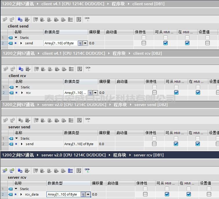 在 S7-1200 兩側,分別創(chuàng)建發(fā)送和接收數(shù)據(jù)塊 DB1 和 DB2,定義成 10 個字節(jié)的數(shù)組,如圖 6 所示。