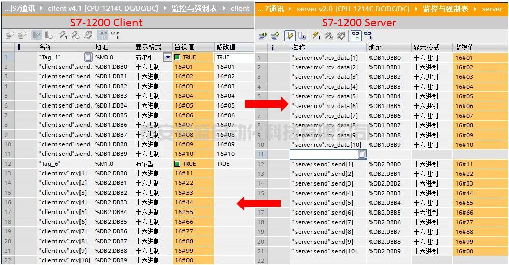 - S7-1200 CPU Clinet 將通訊數(shù)據(jù)區(qū) DB1 塊中的 10 個字節(jié)的數(shù)據(jù)發(fā)送到 S7-1200 CPU server 的接收數(shù)據(jù)區(qū) DB1 塊中;