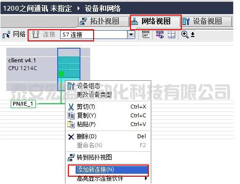 在“設備組態(tài)”中 ,選擇“網(wǎng)絡視圖”欄進行配置網(wǎng)絡,點中左上角的“連接”圖標,連接框中選擇“S7連接”,然后選中client v4.1 CPU(客戶端),右鍵選擇“添加新的連接”,在創(chuàng)建新連接對話框內,選擇連接對象“未指定”,如圖 10 所示。