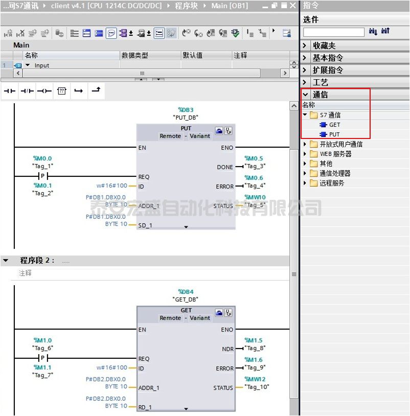 在主動建連接側編程(client v4.1 CPU),在OB1中,從“Instruction” >“Communication” >“S7 Communication”下,調用 Get、Put 通信指令,如圖 8 所示。