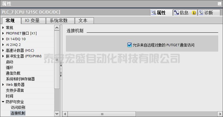請點開作為S7服務器(sever)的 CPU 的設備組態(tài),“屬性->常規(guī)->防護與安全”(V14及以前是“屬性->常規(guī)->保護”)里“連接機制”一項需要勾選“允許來自遠程對象的PUT/GET通信訪問”(V14及以前是“允許從遠程伙伴(PLC\HMI\OPC\...)使用 PUT/GET 通信訪問”),如下圖所示: