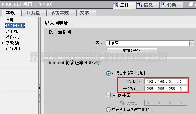 在 “設(shè)備視圖”中點(diǎn)擊 CPU 上代表 PROFINET 通信口的綠色小方塊,在下方會出現(xiàn) PROFINET 接口的屬性,在 “以太網(wǎng)地址” 下分配 IP 地址為 192.168.0.2 ,子網(wǎng)掩碼為 255.255.255.0,如圖 3 所示。