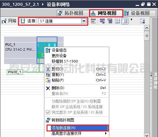 (1)打開 “網(wǎng)絡(luò)視圖” 配置網(wǎng)絡(luò),首先點(diǎn)中左上角的“連接”圖標(biāo),選擇“S7 連接”,然后選中 S7-300 CPU,右鍵選擇“添加新連接”添加新的連接,如圖 7 所示。