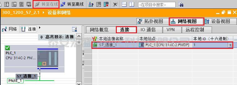 (1)配置完網(wǎng)絡(luò)連接,分別對 S7-300 和 S7-1200 編譯保存并下載。下載完成后,可點(diǎn)擊"轉(zhuǎn)至在線"按鈕,在“網(wǎng)絡(luò)視圖”的“連接”選項(xiàng)卡中查看連接狀態(tài),如圖 14 所示,本地連接名稱“S7_連接_1”左側(cè)有綠色標(biāo)志,則表示組態(tài)的連接已經(jīng)成功建立。