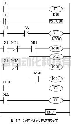 按照?qǐng)D5-7提供的梯形圖,利用計(jì)算機(jī)或手持編程器寫入PLC。