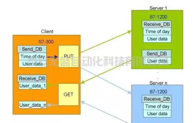 主站和從站包含了發(fā)送和接收塊(Send_DB和Receive_DB)。在接收到同步命令之后,主站讀取系統(tǒng)時間,并通過PUT塊將此信息和用戶數(shù)據(jù)發(fā)送到第一個從站,以進行S7通信。PUT塊將它自己的系統(tǒng)時間與從主站中接收到的日時鐘鐘信息進行同步。然后主站通過GET通信塊獲得從站1的用戶數(shù)據(jù)。之后將從站1的此用戶數(shù)據(jù)存儲在主站接收塊的相關位置中。對所有后續(xù)從站單元重復此過程。在完成主站和最后一個從站之間的數(shù)據(jù)交換之后,主站單元重新啟動與從站1的數(shù)據(jù)交換。