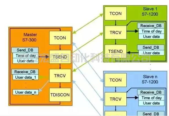 主站和每個從站都有一個發(fā)送和一個接收數(shù)據(jù)塊(Send_DB和Receive_DB)。通過TCON塊,主站將一個TCP/IP連接請求發(fā)送到第一個從站。要確認連接已建立,通信對端也要執(zhí)行TCON塊。當存在同步作業(yè)時,主站讀取系統(tǒng)時間,并通過TSEND通信塊將此時間和用戶數(shù)據(jù)發(fā)送到從站。