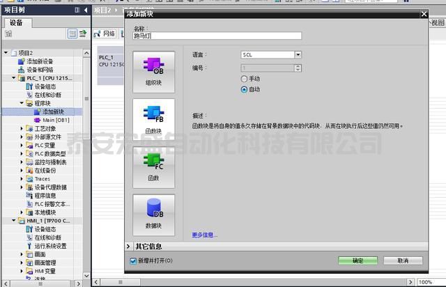 2.雙擊“項目樹”-“PLC_1”-“程序塊”下的“添加新塊”,彈出添加新塊對話框,在對話框中選擇FB函數(shù),修改名稱,并將語言修改為SCL,單擊“確定”按鈕,完成程序塊的添加,如下圖所示。