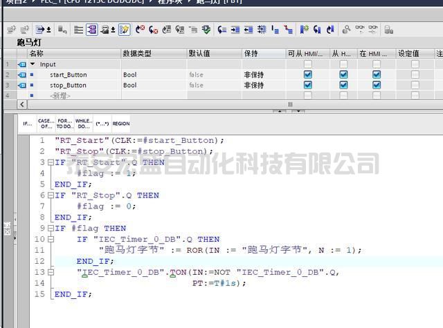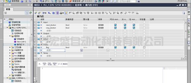 3.在FB函數(shù)塊的接口處定義三個變量,分別是啟動按鈕、停止按鈕、啟動標志的三個形參,如下圖所示。