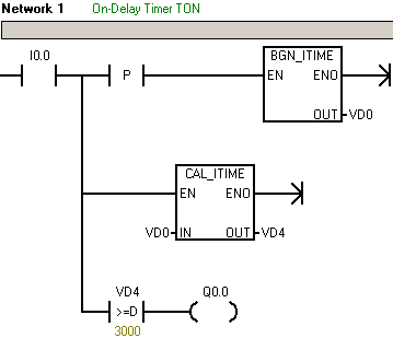 輸入點(diǎn) I0.0 接通(上升沿) 3 秒后(3000 ms), 輸出點(diǎn) Q0.0 置位。