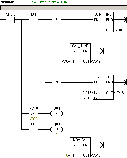 如果輸入點(diǎn) I0.1 的接通時(shí)間等于或大于 3 秒 (3000 ms),輸出點(diǎn) Q0.1 置位。輸入點(diǎn) I0.2 用于復(fù)位。