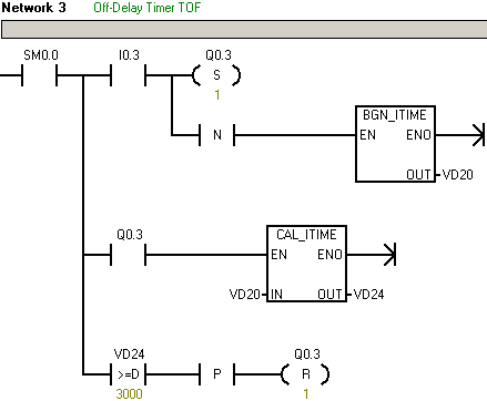 輸入點(diǎn) I0.3 斷開(下降沿) 3 秒 (3000 ms) 后,輸出點(diǎn) Q0.3 復(fù)位。